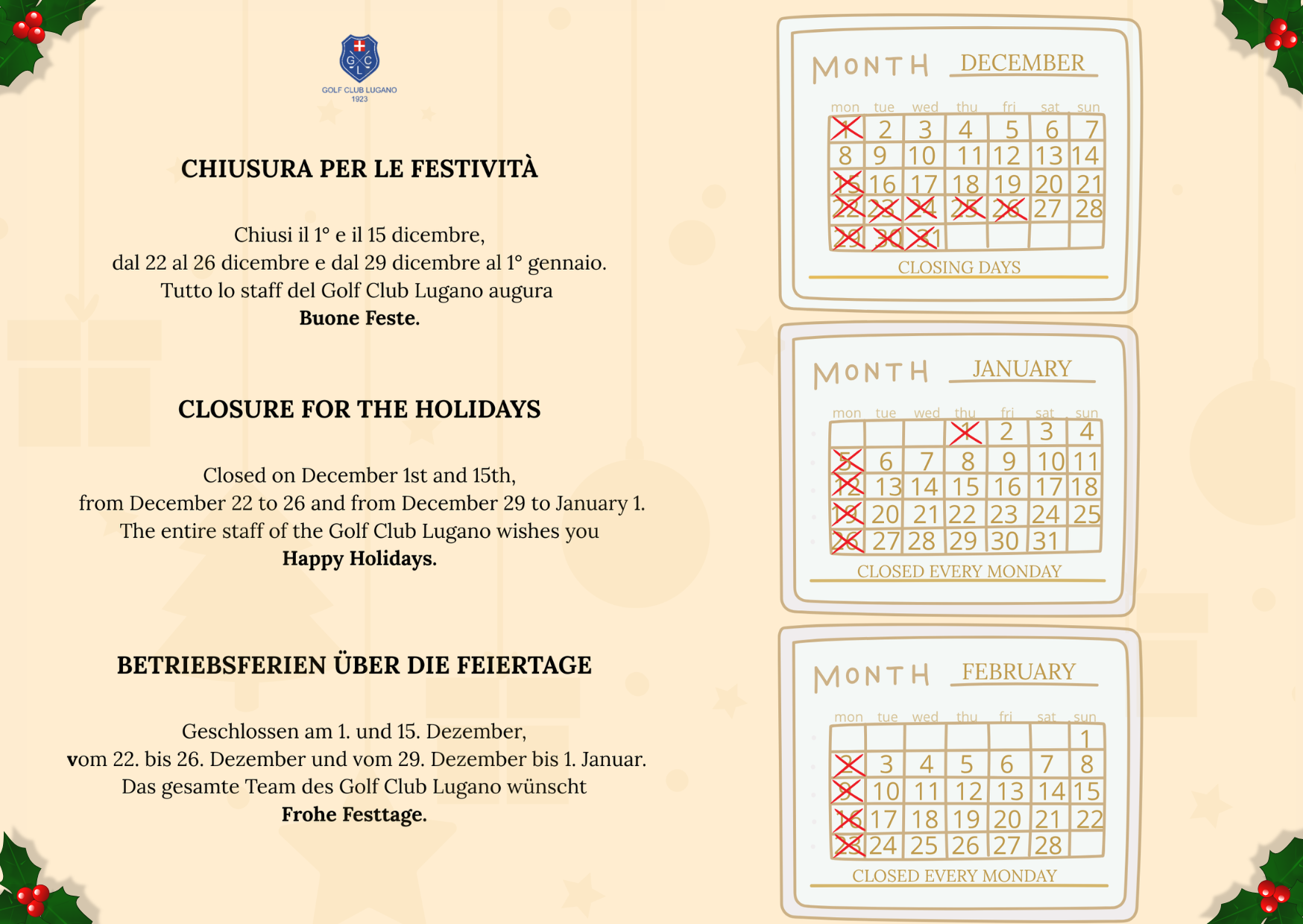 GIORNI DI CHIUSURA / PROMOZIONE INVERNALE